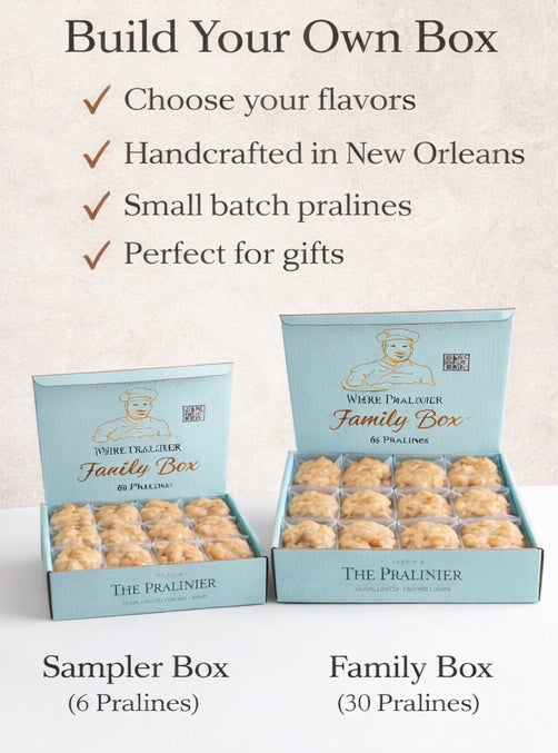The celebration starts here. Our Party Box lets you mix & match 30 pralines for the ultimate crowd-pleaser—perfect for events, client gifts, weddings, showers, and holiday tables. Big flavor, big Louisiana energy, and plenty to go around.